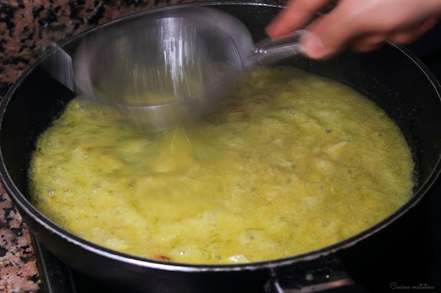 Sobre estos, echamos el bacalao y la cayena y movemos para que se vaya desprendiendo la gelatina del pescado.
